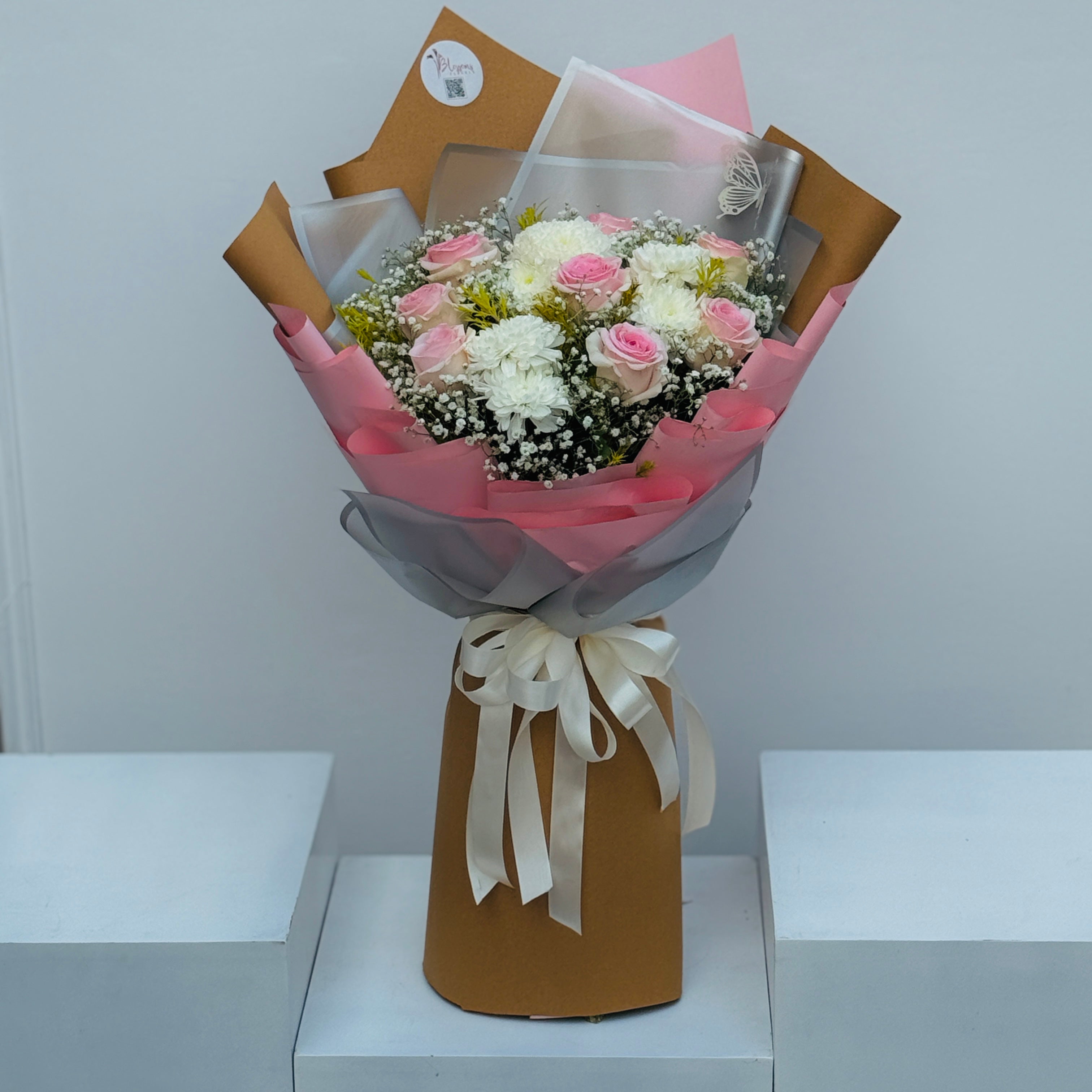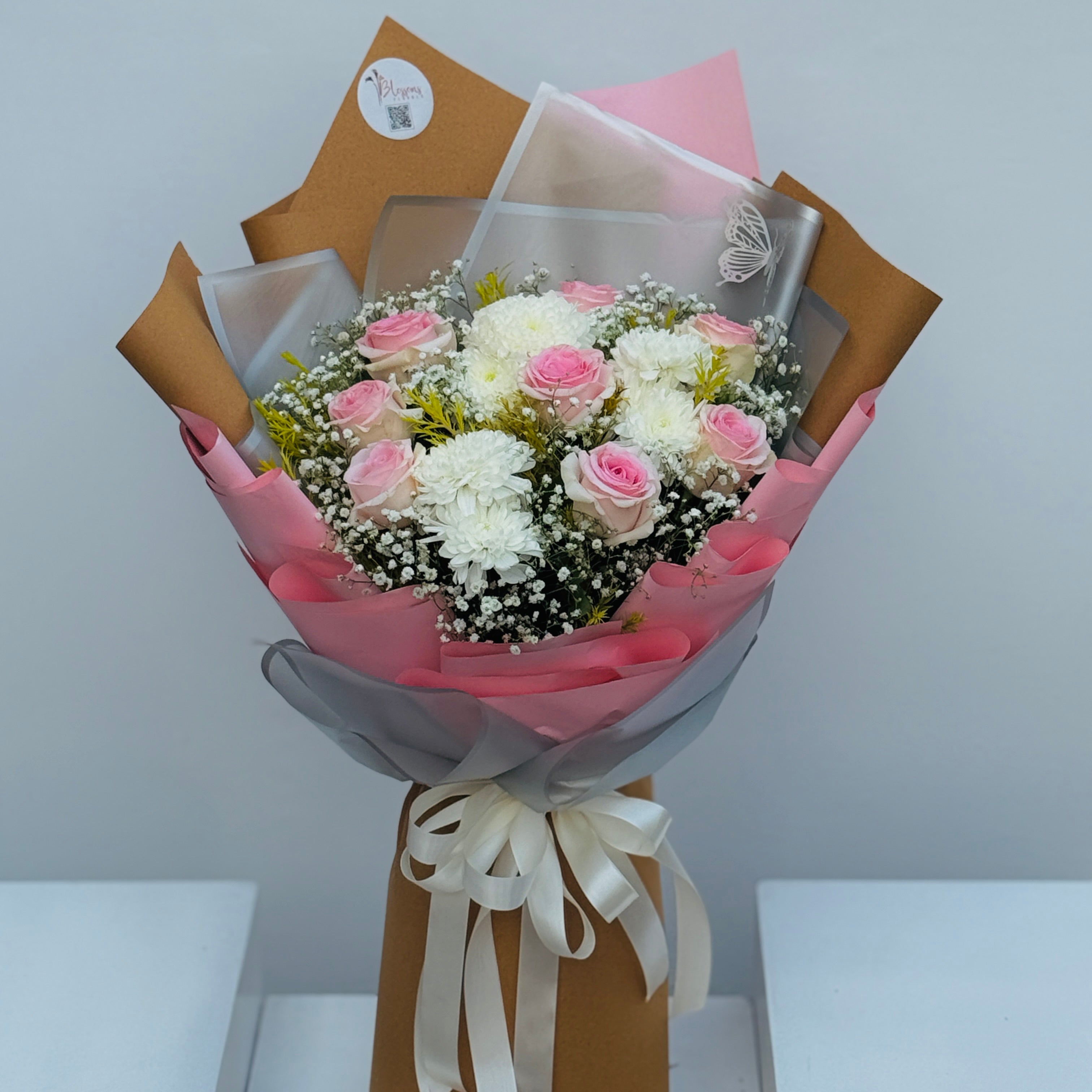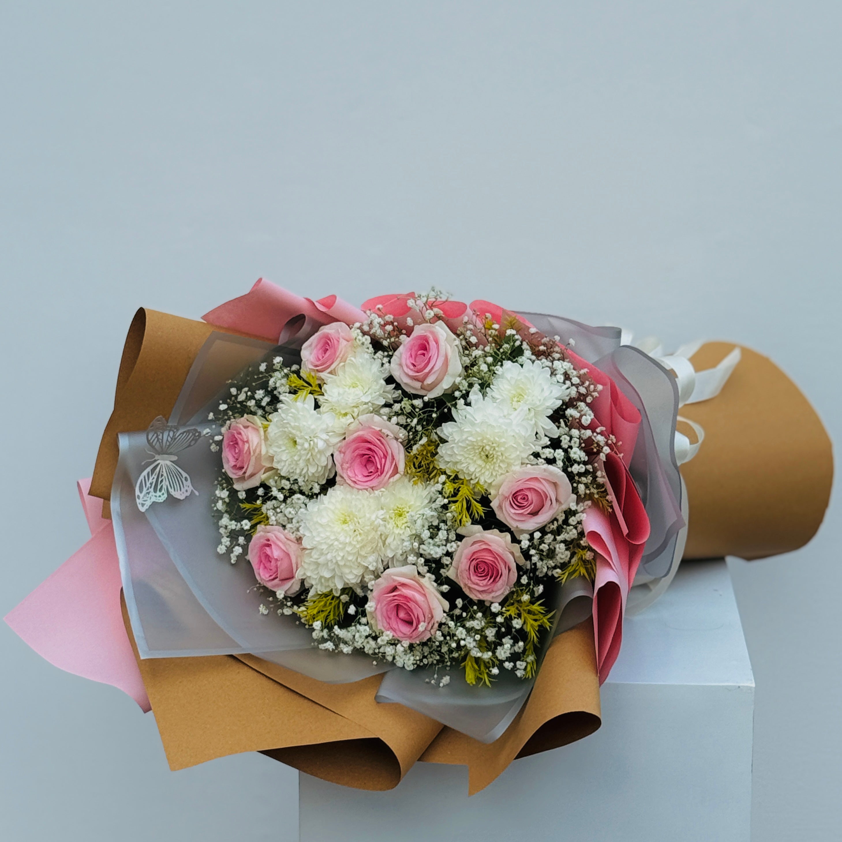 Classic and elegant, Borderline Norm pairs roses, chrysanthemums, and baby breath for a sophisticated bouquet. Perfect for birthdays, anniversaries, or thoughtful gifts.