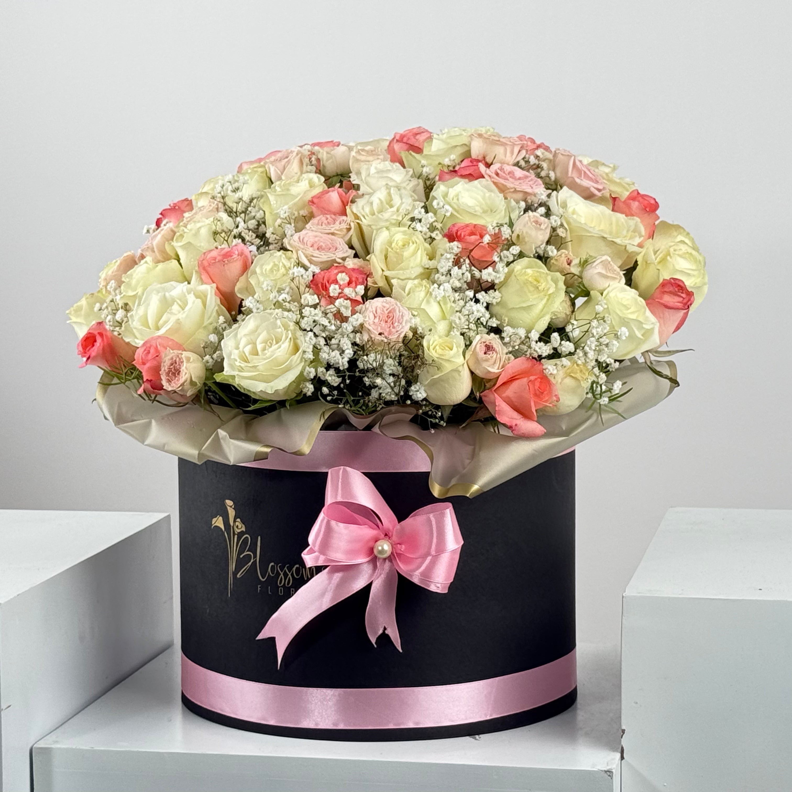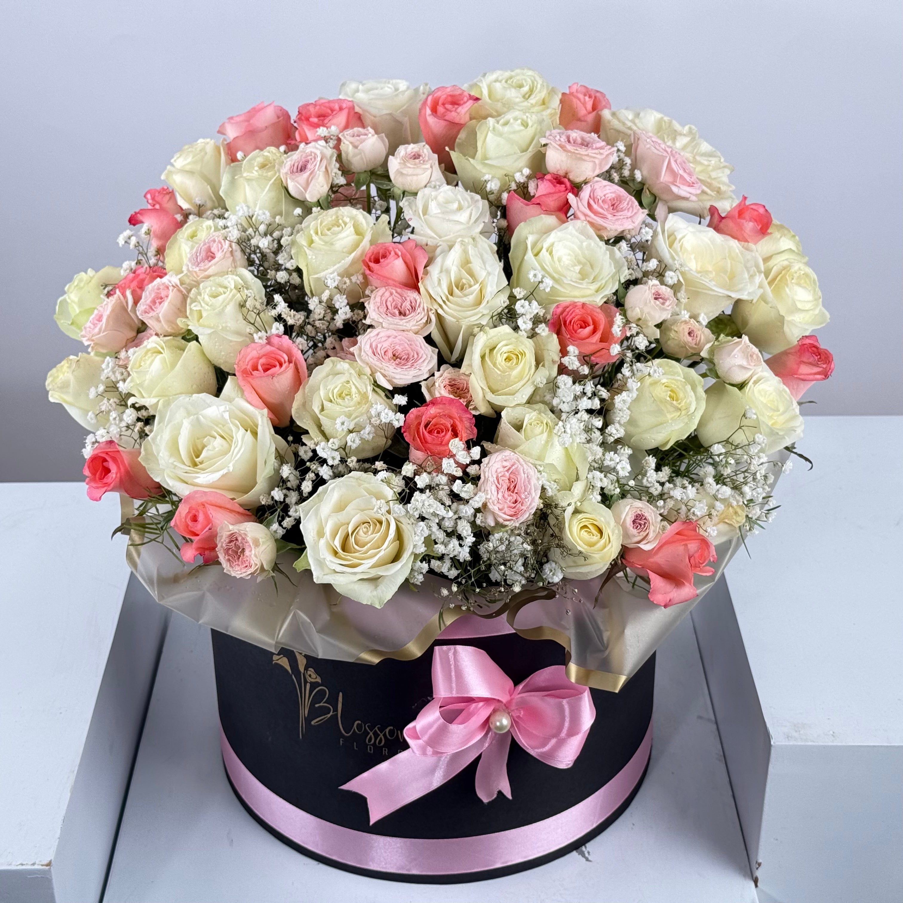 Haven At-Last is a floral box that combines elegance and care. Roses paired with baby breath create a bouquet that is perfect for birthdays, anniversaries, or thoughtful apologies.