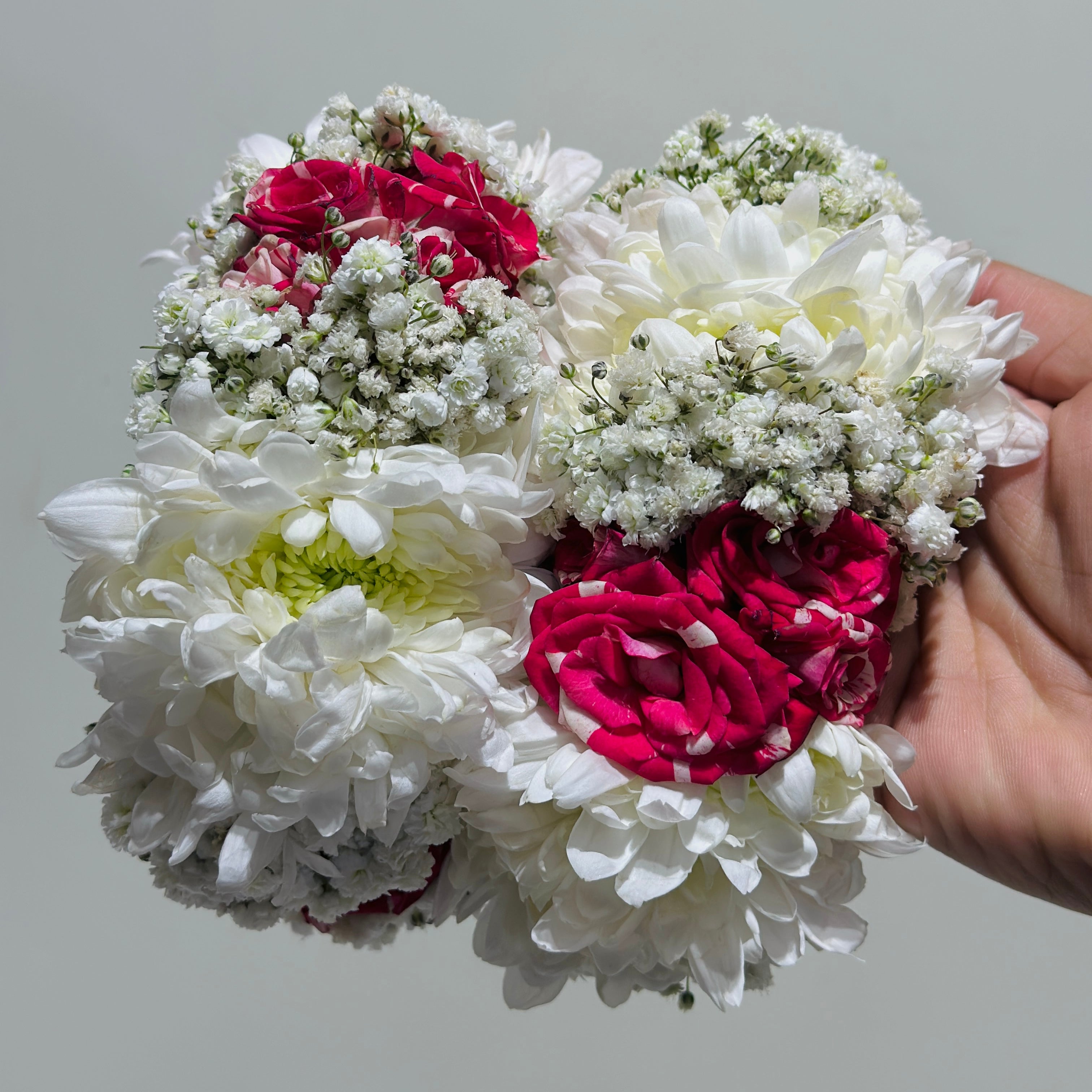 Featuring chrysanthemums, baby breath, and spray roses, the arrangement creates a harmonious blend of texture and freshness.