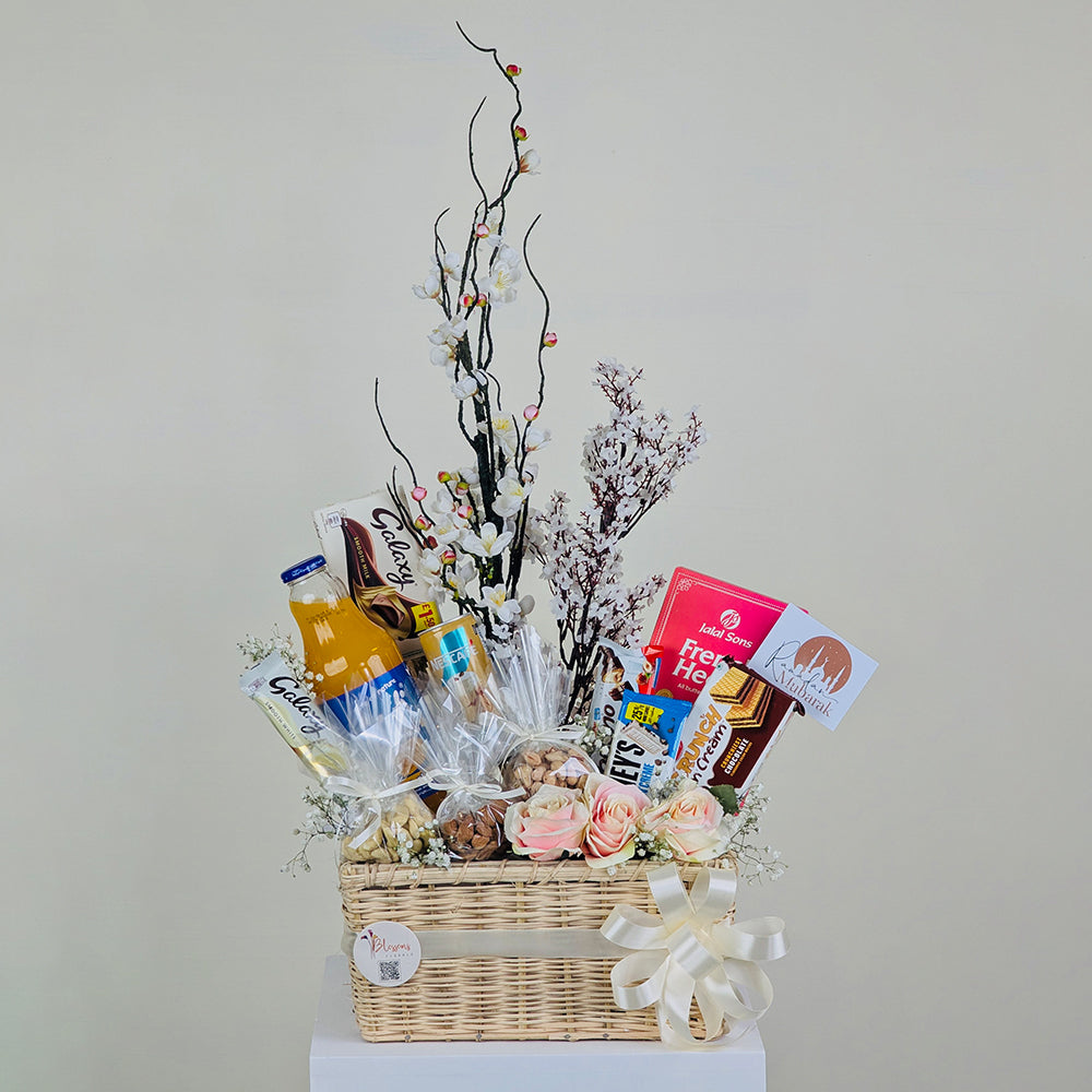 This charming arrangement includes premium roses, chrysanthemums, seasonal leaves, and carefully selected chocolates — making it perfect for Iftar surprises or family gifting. Designed with balance and elegance, it captures both beauty and generosity.