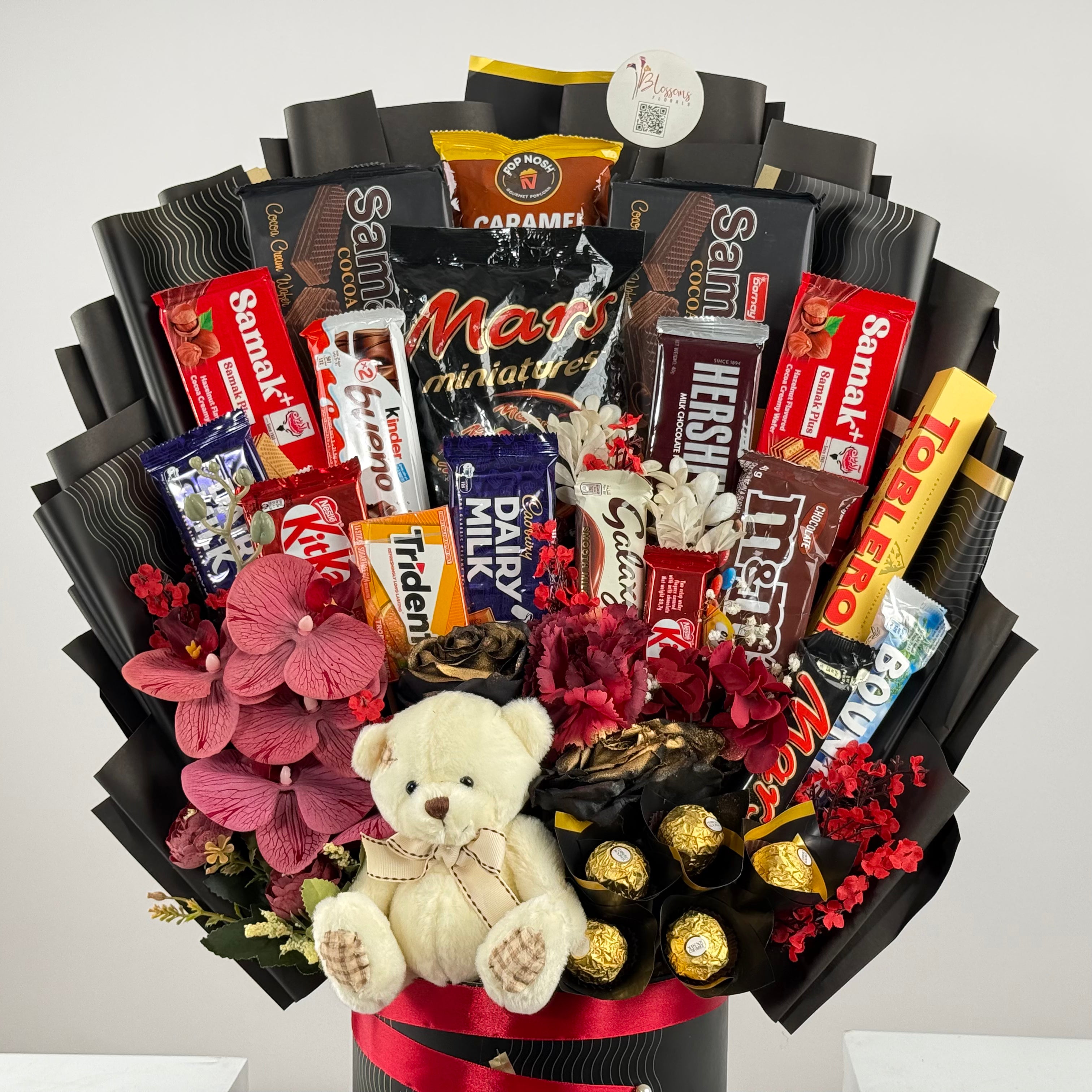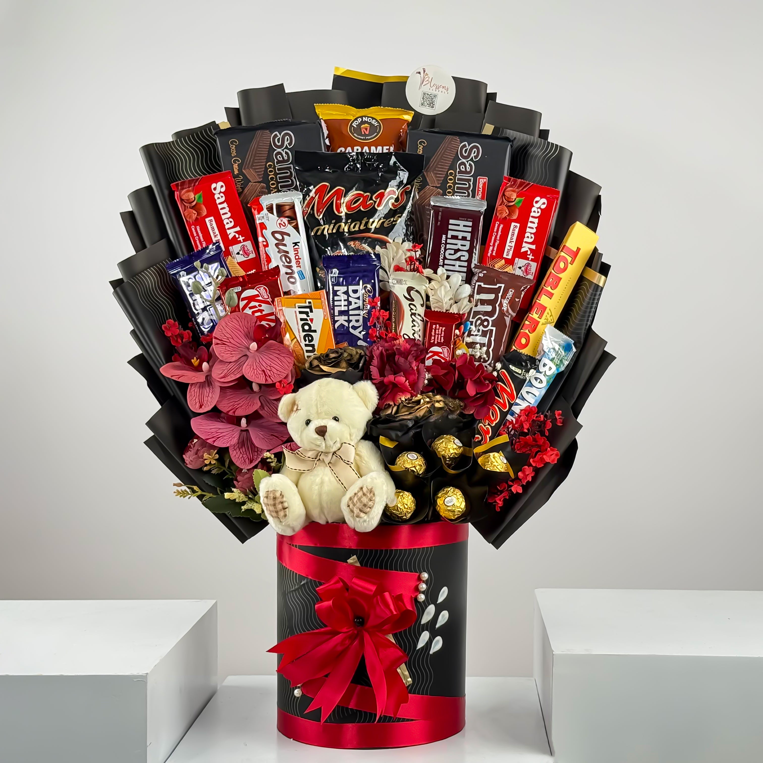Featuring fresh roses, soft chrysanthemums, leafy textures, and a touch of luxurious chocolates, this bouquet feels vibrant and full of life. Every detail is arranged to surprise and impress.